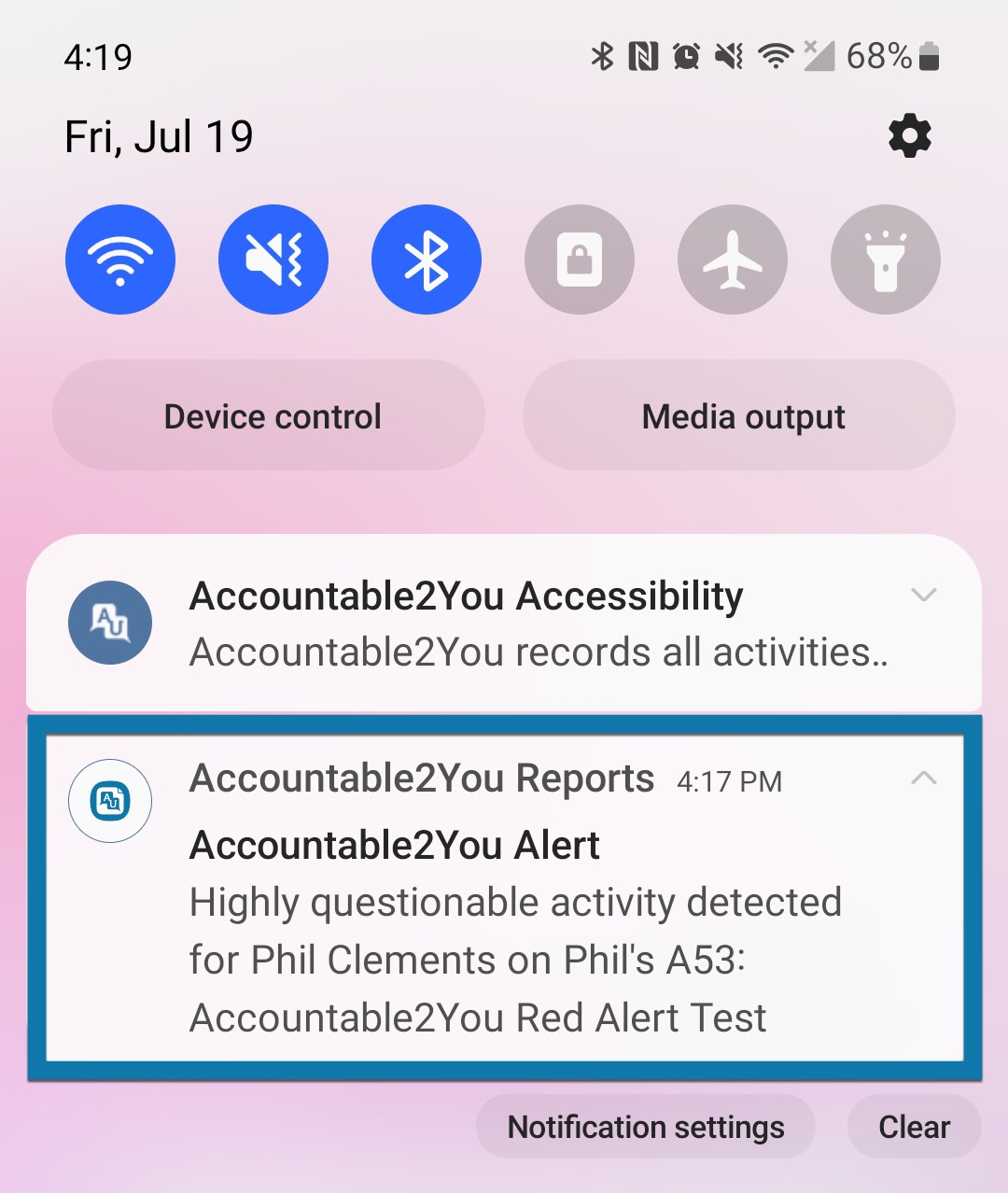 When questionable content is detected, Accountable2You triggers alerts to the accountability partners for that device based on the rating categories below. Partners can manage how they receive these alerts by adjusting their Alert Settings.