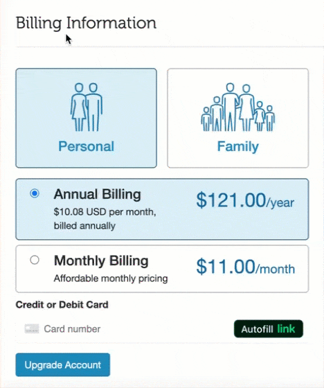 - Select your desired plan (Personal or Family) and billing frequency (Monthly or Annual).