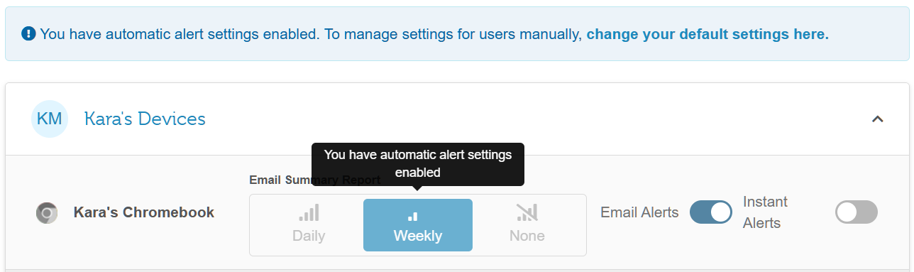 If you’re unable to edit your personal Alert Settings, you’ll most likely see a message stating “You have automatic alert settings enabled.”