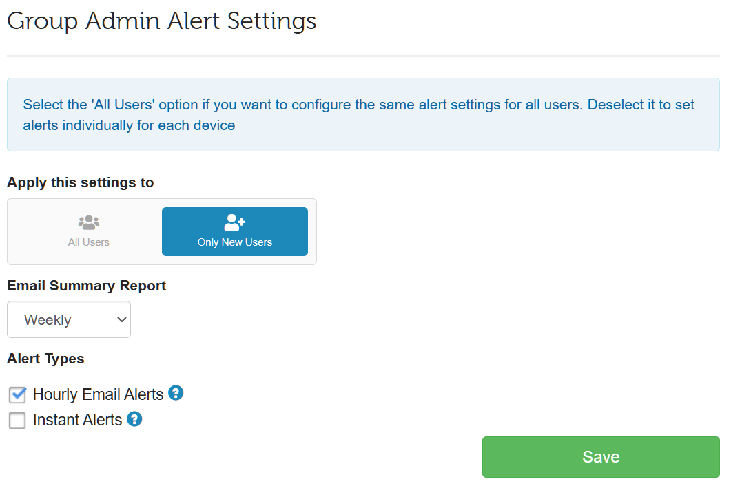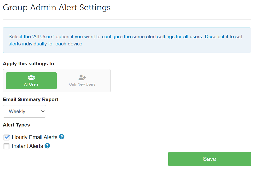 While logged into your admin profile, you can only determine the alerts that you receive. Currently, each group member (including other admins) is responsible for adjusting their own Alert Settings.
